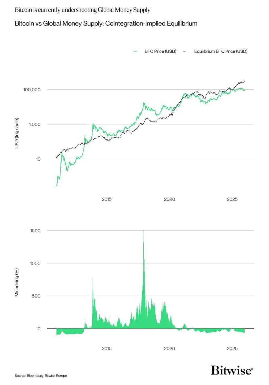 Grafika, označena kao “Bitcoin protiv globalne ponude novca: implicirana ravnoteža kointegracije”, prikazuje tržišnu cijenu BTC-a u odnosu na točkastu ravnotežnu liniju na logaritamskoj ljestvici od ranih 2010-ih do 2025. U posljednjem segmentu, zelena BTC linija nalazi se ispod točkaste serije, što ukazuje na negativan jaz u odnosu na impliciranu razinu modela.
