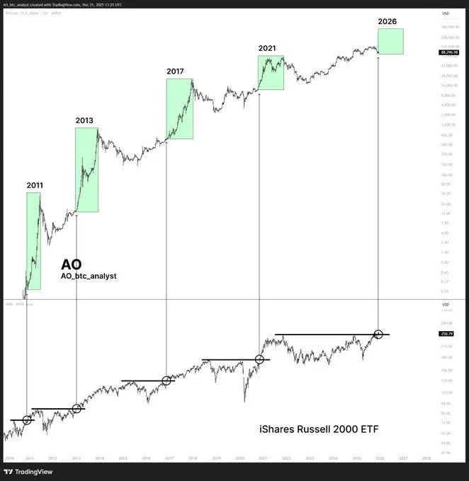Grafikon označava prethodne točke proboja Russell 2000 vodoravnim linijama otpora i krugovima, a zatim ih vizualno poravnava s ranijim uzlaznim trendovima Bitcoina istaknutim u zelenim okvirima s oznakama 2011., 2013., 2017. i 2021. Novi zeleni okvir s oznakom 2026 pojavljuje se u gornjem desnom kutu, sugerirajući predviđeni nastavak ako se obrazac ponovi.